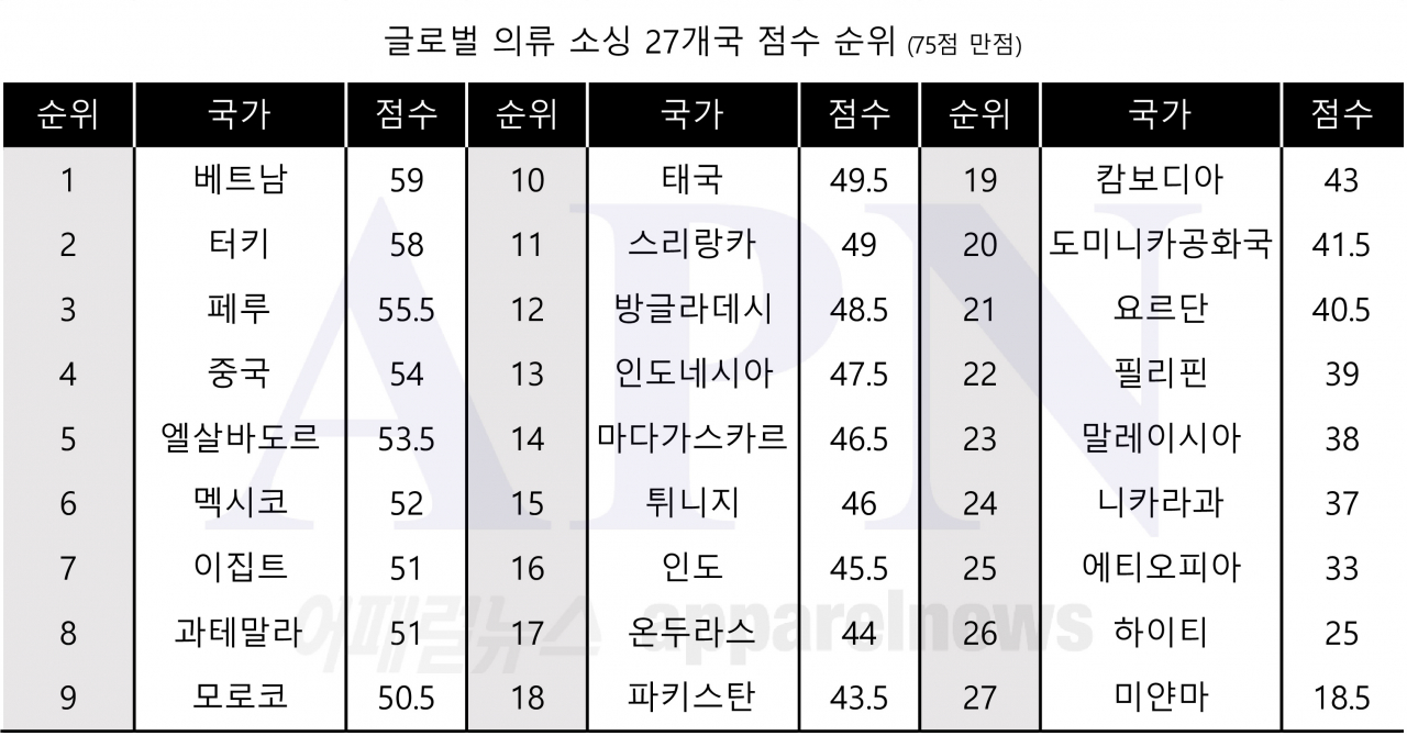 미국 섬유 의류 전문 매체인 저스트 스타일(Just Style)이 글로벌 데이터의 어패럴 인텔리전스 센터(Global Data’s Apparel Intelligence Center)와 공동으로 27개 소싱국을 대상의 15개 항목에 걸친 평가와 함께 톱10 국가를 발표했다.