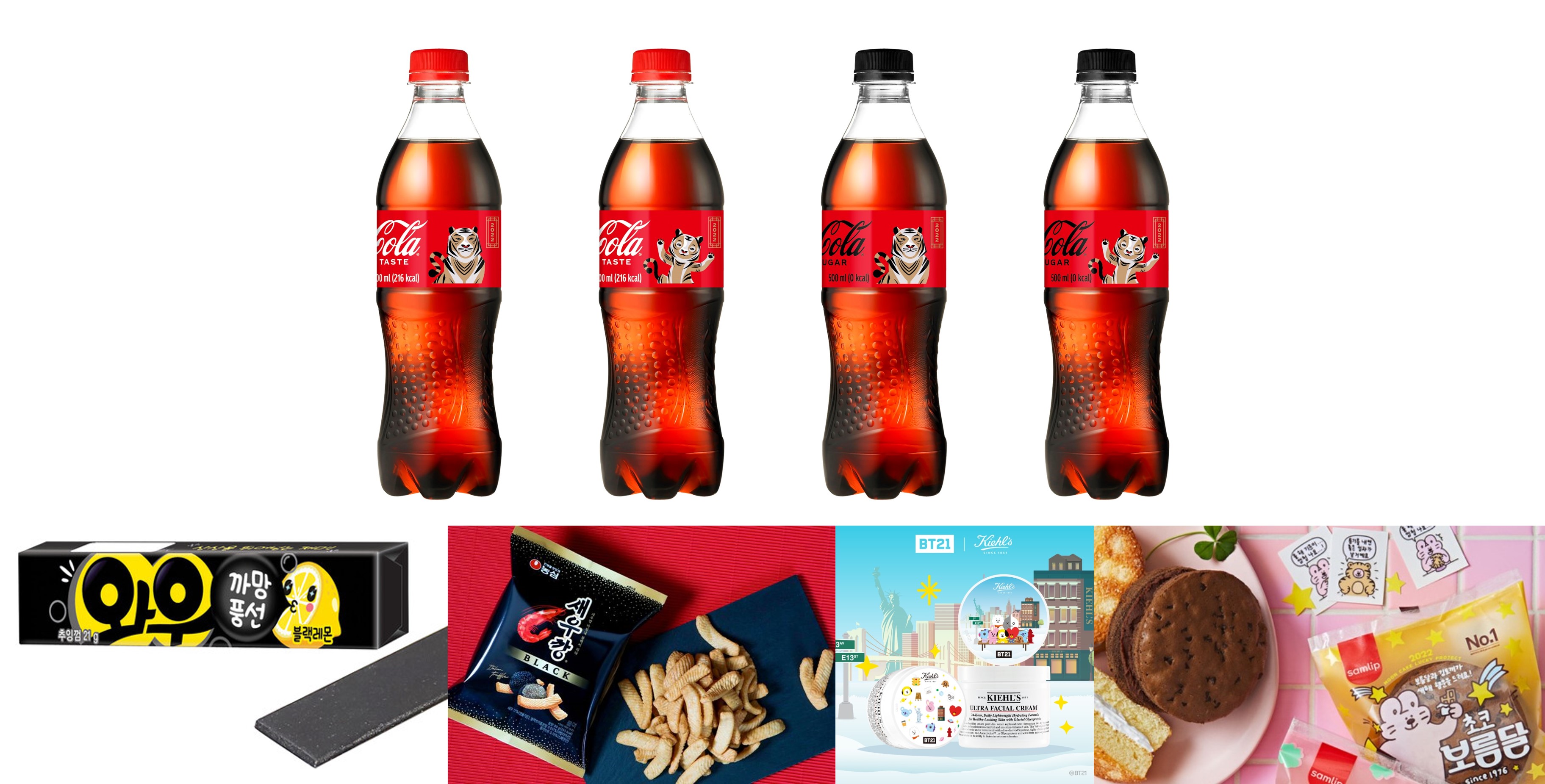 사진: 좌측 상단부터 시계방향: 코카-콜라 타이거 패키지, 오리온 와우 블랙레몬, 농심 새우깡 블랙, 키엘 ‘울트라 훼이셜 BT21 에디션’, SPC삼립 보름달빵