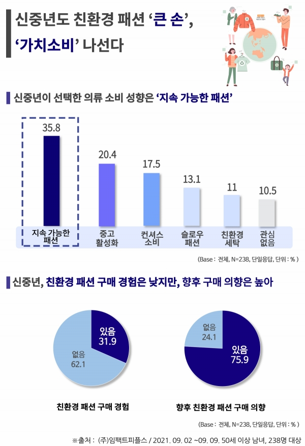 시니어 소셜벤처 임팩트피플스(대표 신철호)가 2021년 9월 2일부터 9월 9일까지 50세 이상, 238명을 대상으로 신중년의 친환경 패션 트렌드를 조사한 결과, 70%의 신중년이 ‘패션 산업이 환경 오염에 영향을 미친다’고 답했다.