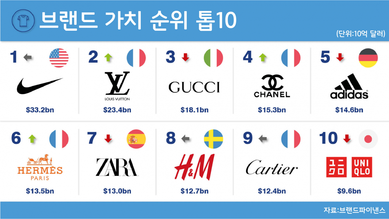 브랜드 가치 조사 전문의 영국 브랜드파이낸스(Brands Finance)가 매년 발표하는 브랜드 가치 순위 보고서에서 나이키가 지난해보다 9% 증가한 332억 달러의 가치로 1위 자리를 지켰고, 팬데믹 이후 상승세를 탄 명품 브랜드들이 뒤를 이어 2위 루이비통, 3위 구찌, 4위 샤넬 등으로 조사됐다.