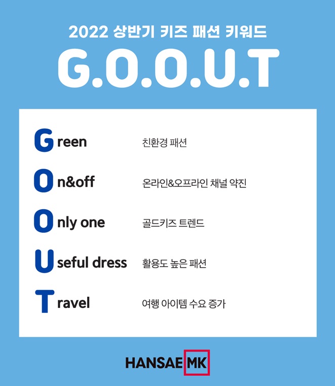 국내 대표 패션기업 한세엠케이(각자대표 김동녕, 김지원, 임동환)가 2022년 상반기 키즈 패션 트렌드 키워드로 ‘G.O.O.U.T’을 선정했다고 밝혔다.
