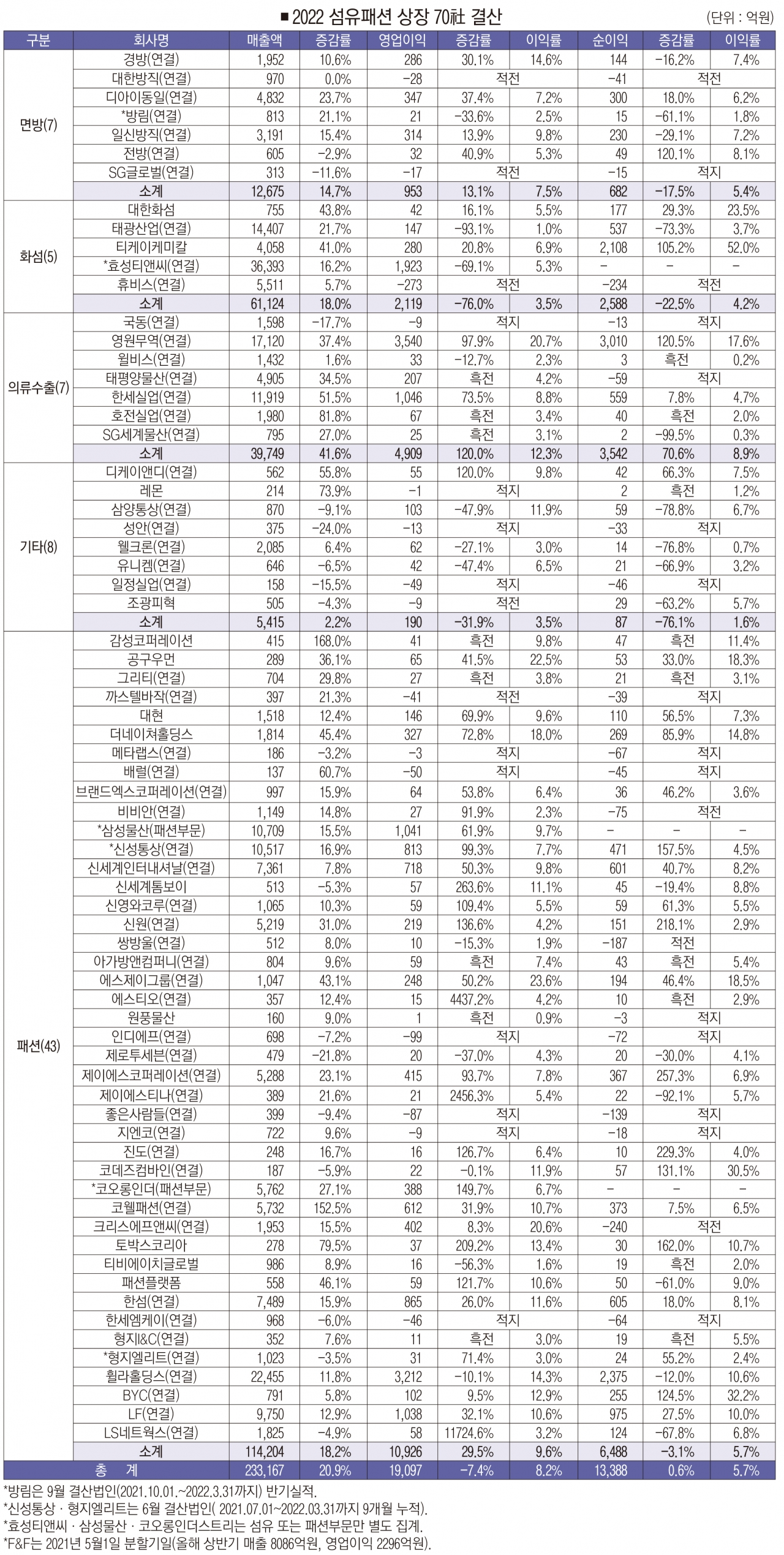2022 섬유패션 상장 70사 상반기 결산 - 패션·의류수출, 리오프닝 효과로 성장·내실 다 잡았다