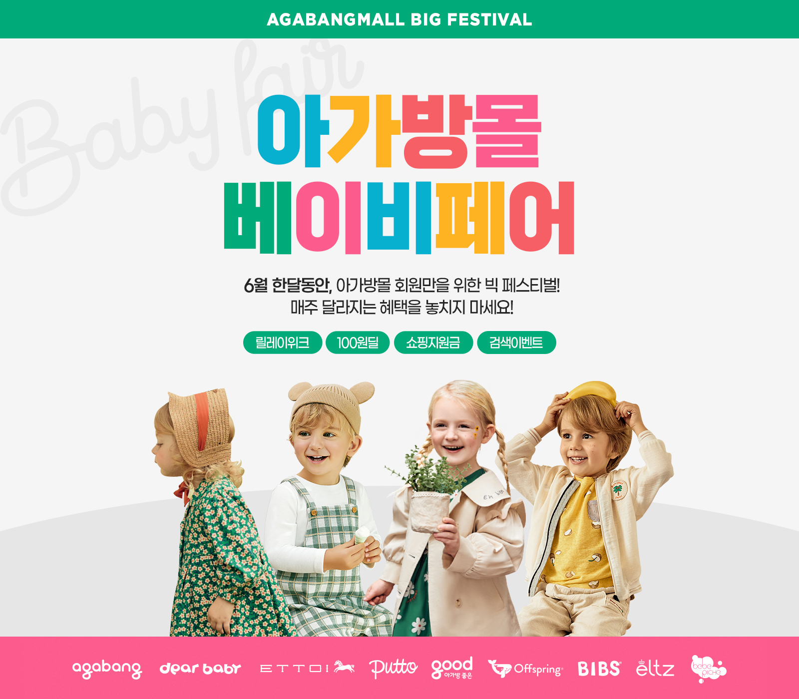 6월 한달 동안 진행되는 이번 행사는 주차별로 여러가지 테마의 기획전을 마련해 다양한 상품을 합리적인 가격으로 만나볼 수 있도록 구성됐다. 1주차에는 아가방앤컴퍼니의 의류와 유아용품을 반값에 구매할 수 있는 ‘반값대전’이 진행되고 2주차에는 프리미엄 유아 스킨케어 퓨토을 할인가에 구입할 수 있는 ‘퓨토 단독전’이 진행된다. 3주차에는 젖병, 젖병소독기 등 예비부모를 위한 출산준비물이 한 곳에 모인 ‘출산대전’이, 4주차에는 럭셔리 유아 브랜드 에뜨와의 의류와 아기를 위한 유기농 화장품 ‘에뜨와 오가닉’을 할인하는 ‘에뜨와 특집전’ 이 열리며 5주차에는 전 브랜드의 신상 아이템과 베스트상품을 모은 ‘NEW&BEST’ 기획전이 진행된다.