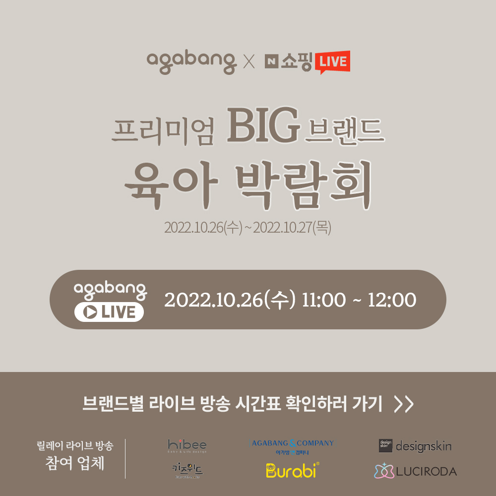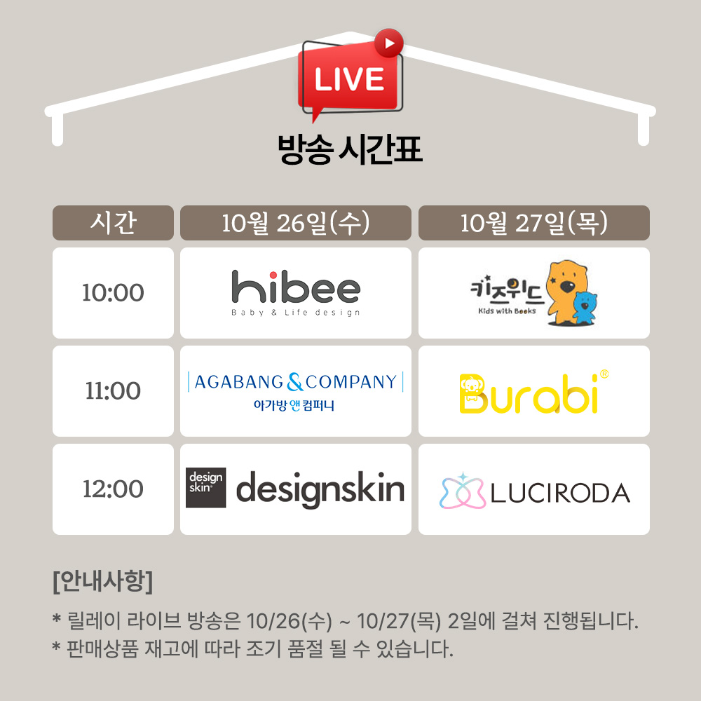 이번 릴레이 라이브는, ▲아가방앤컴퍼니 ▲디자인스킨 ▲하이비 ▲키즈위드 ▲브라비 ▲루시로다 총 6개 업체가 참여하며, 각 브랜드 별 60분씩 26일 3개 업체, 27일 3개 업체 라이브가 진행 예정이다.