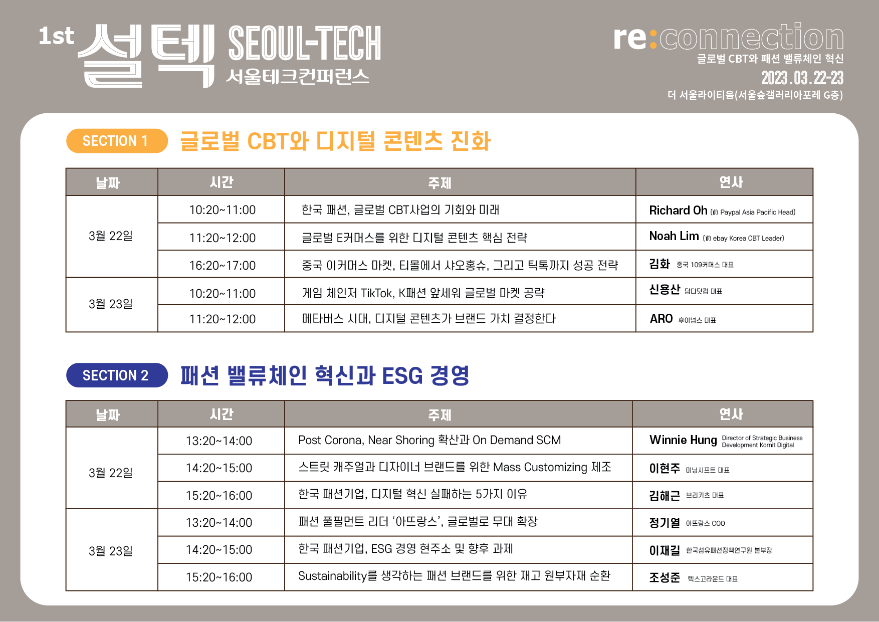 수 있는 디지털 콘텐츠 구축까지, 최근 국내 패션기업들의 고민을 한 자리에서 해소할 수 있는 1st 설텍(Seoul-Tech) 컨퍼런스가 3월 22일과 23일 이틀간