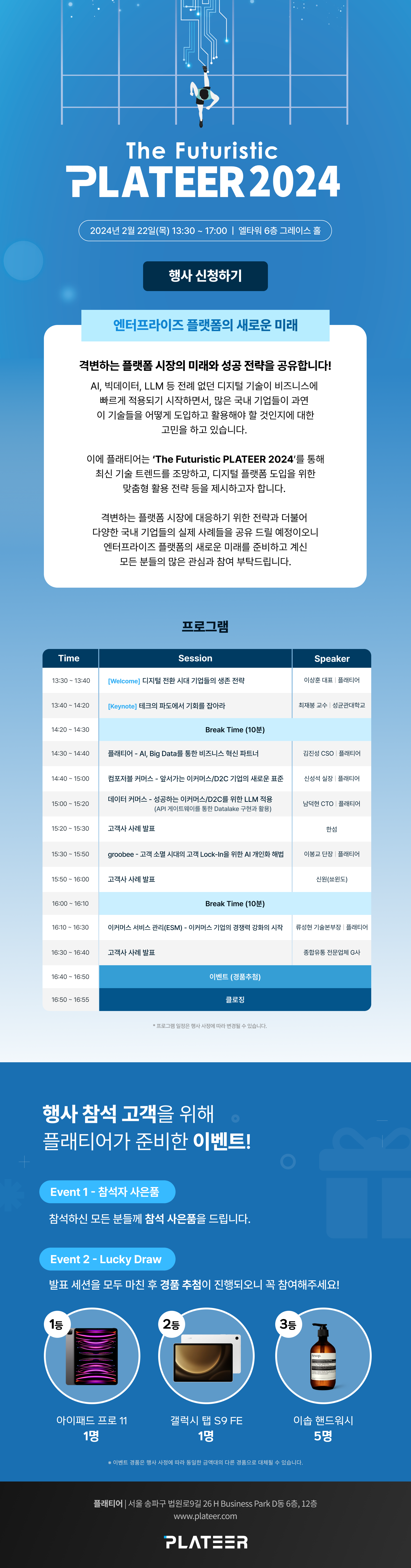 The Futuristic PLATEER 2024 행사에서는 최신 기술 트렌드를 조망하고, 디지털 플랫폼 도입을 위한 맞춤형 활용 전략 등을 제시하고자 합니다.