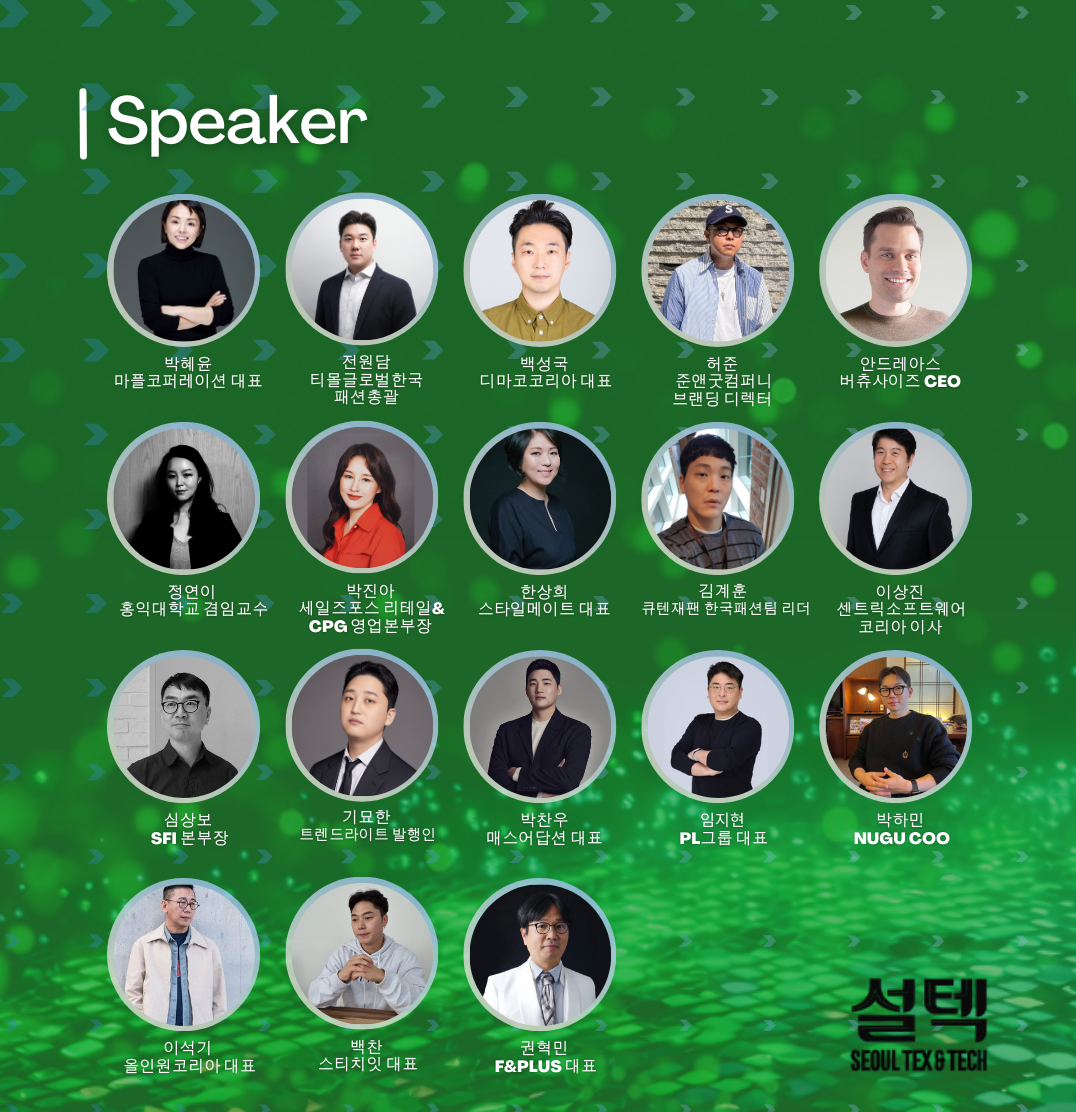 △브랜딩 부문에서는 글로벌 탑티어 브랜드들의 국내 디지털 마케팅을 책임지고 있는 디마코코리아와 글로벌 인플루언서까지 연계하고 있는 스타일메이트, 그리고 GFFG, 글로우서울 CMO 출신인 허준 준앤굿컴퍼니 브랜딩 디렉터 등 최고 실력자들이 강연을 발표한다. 또 최근 크리에이터 이코노미 마켓을 리드하고 있는 박혜윤 마플코퍼레이션 대표가 실제적인 경영 스토리를 들려줄 예정이며, 심상보 SFI 본부장은 패션기업 지속가능성 향상시키는 ESG 경영을 발표한다.