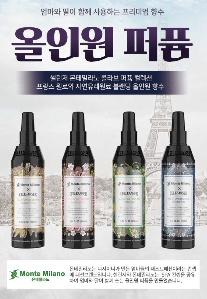 시니어들의 패스트 패션 브랜드 몬테밀라노(디자이너 실비아 오)가 퍼퓸 라인업을 확정 짓고 화장품 SPA 브랜드 셀린저(제조사 한솔생명과학)와 함께 몬테밀라노 올인원 퍼퓸 4종을 론칭한다. 이번 제품 론칭의 슬로건인 “엄마와 딸이 함께 사용하는 프리미엄 향수”로 아이템을 선정했다.