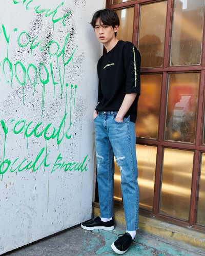 워싱 크롭테이퍼드 제품도 반응이 좋다. 연청과 진청 중간 색상으로 자연스러운 데님 스크래치가 포인트로 들어갔다.