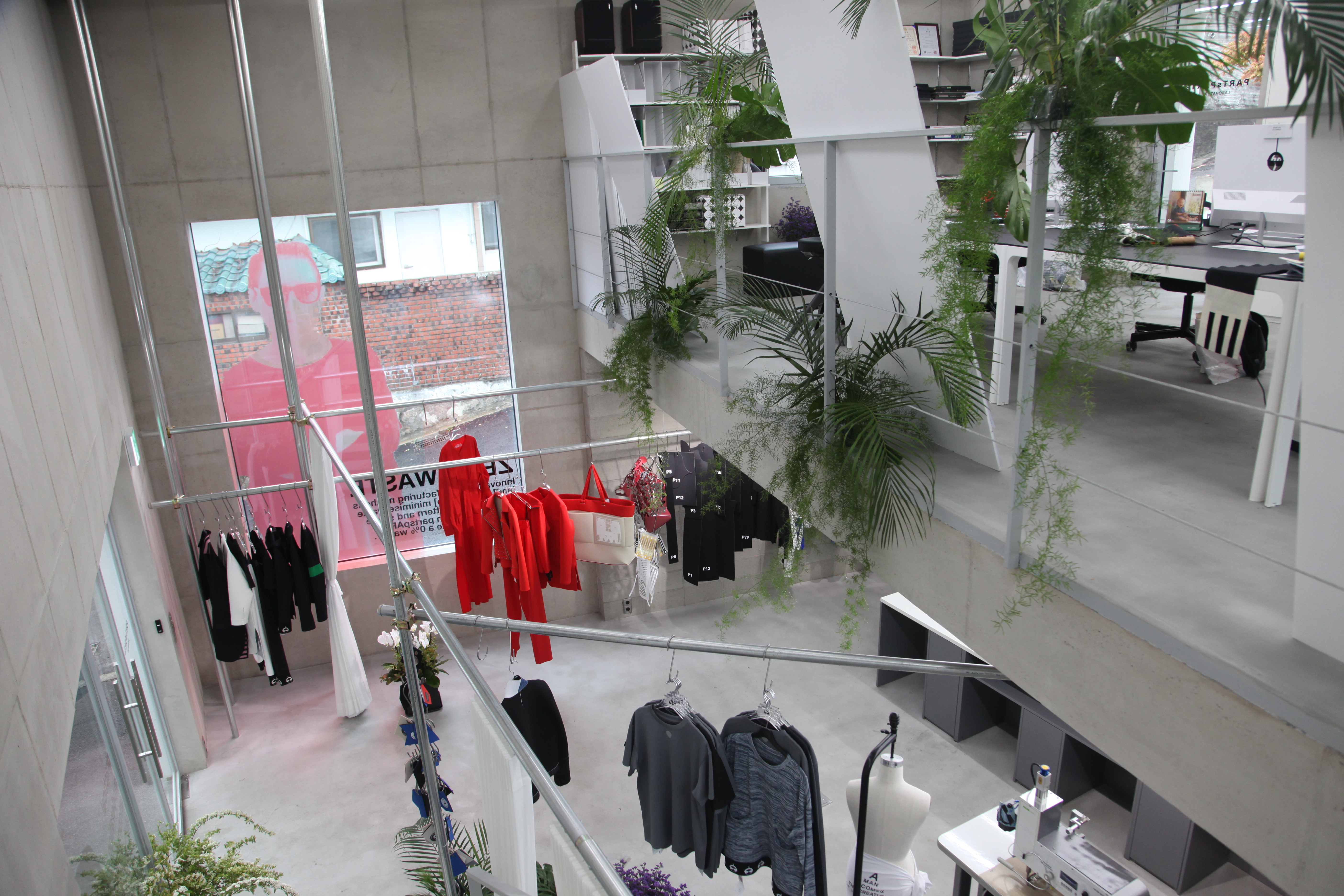 파츠파츠랩 1층은 네오프렌의 제로웨이스트 실험 과정을 오픈스튜디오 형식으로 전개하며 2층은