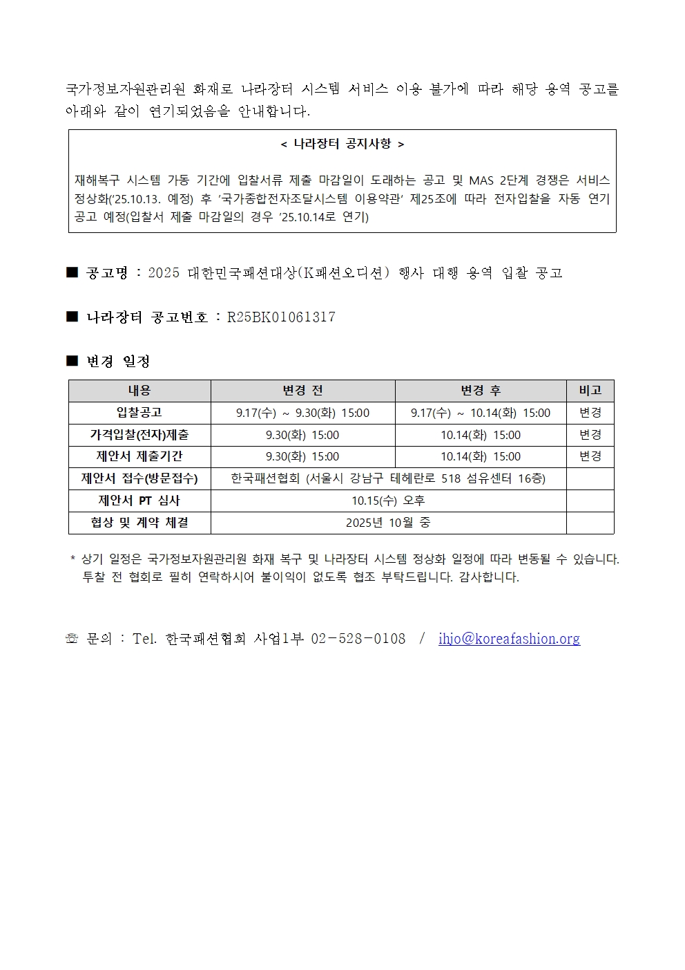 [공고] 2025 대한민국패션대상(K패션오디션) 행사 대행 용역 입찰 공고 연기.pdf [98.51KB]