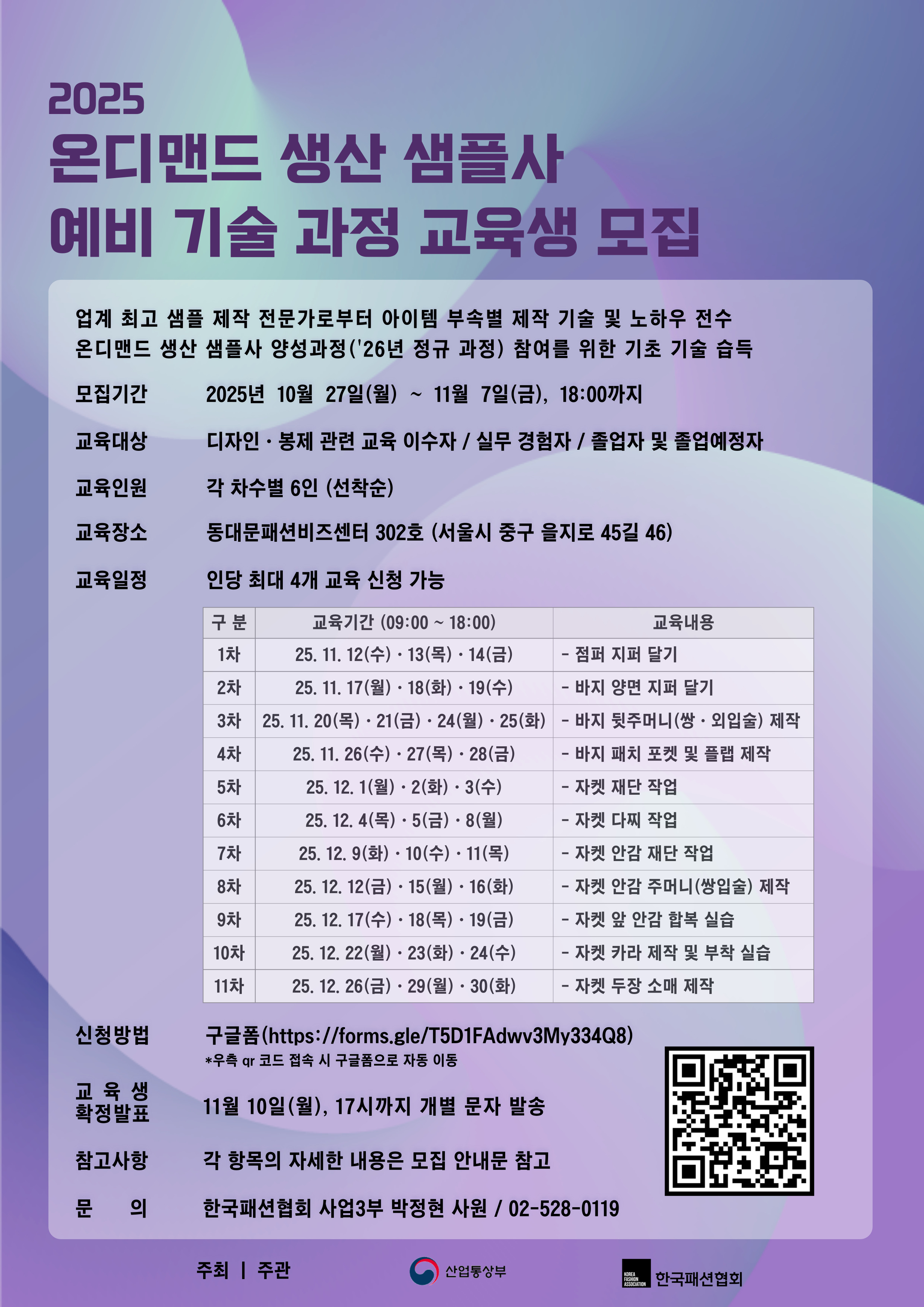 [모집] 온디맨드 생산 샘플사 예비 기술 과정 교육생 모집(~11.7 마감)