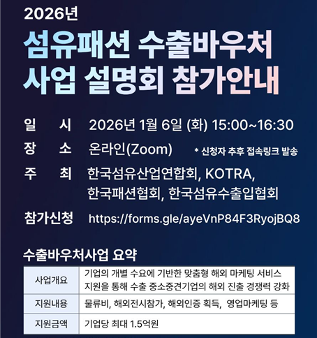 [안내] 2026년도 섬유패션업계 수출바우처사업 설명회 참가신청 안내(1/6(화) 15:00, 온라인)