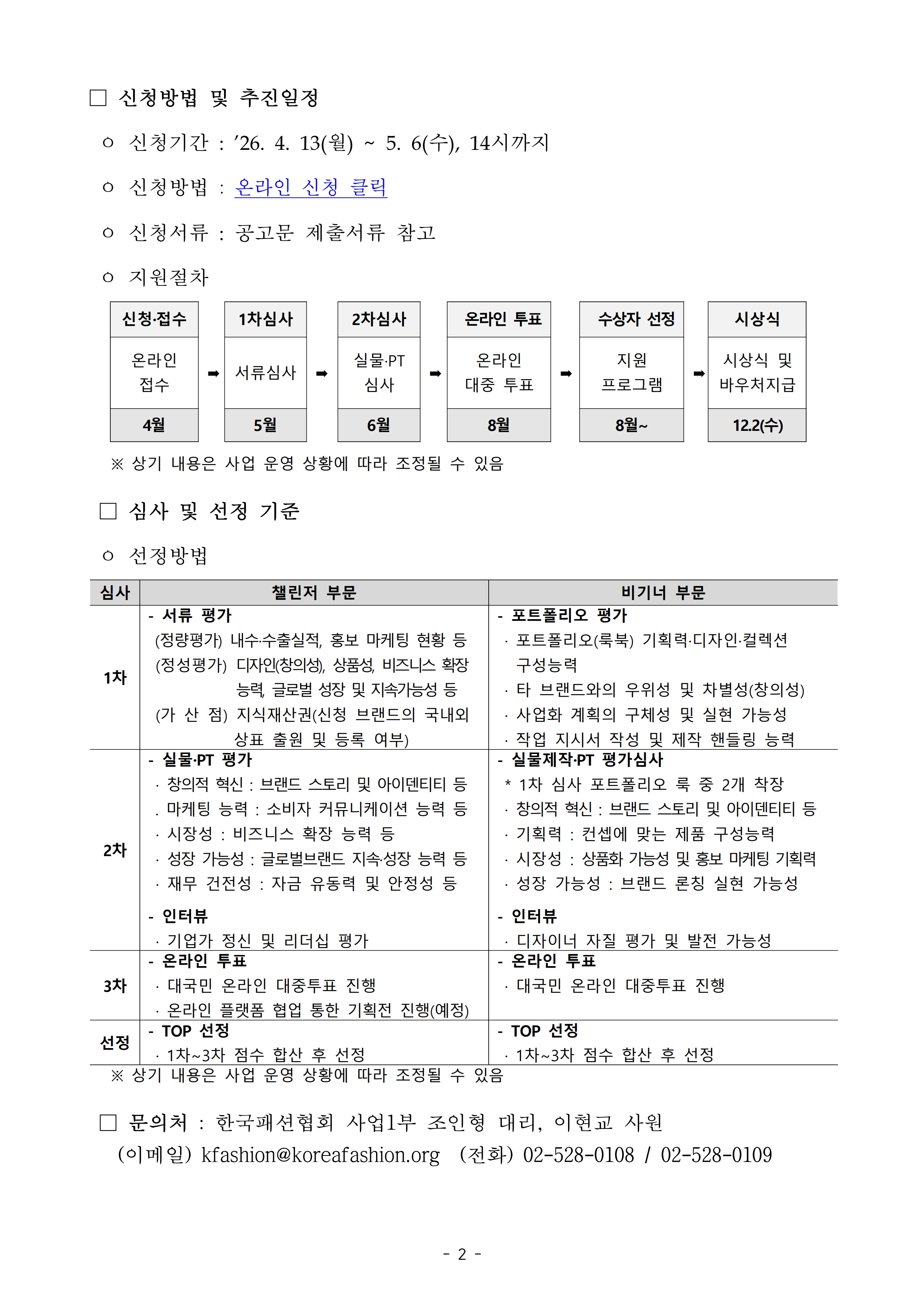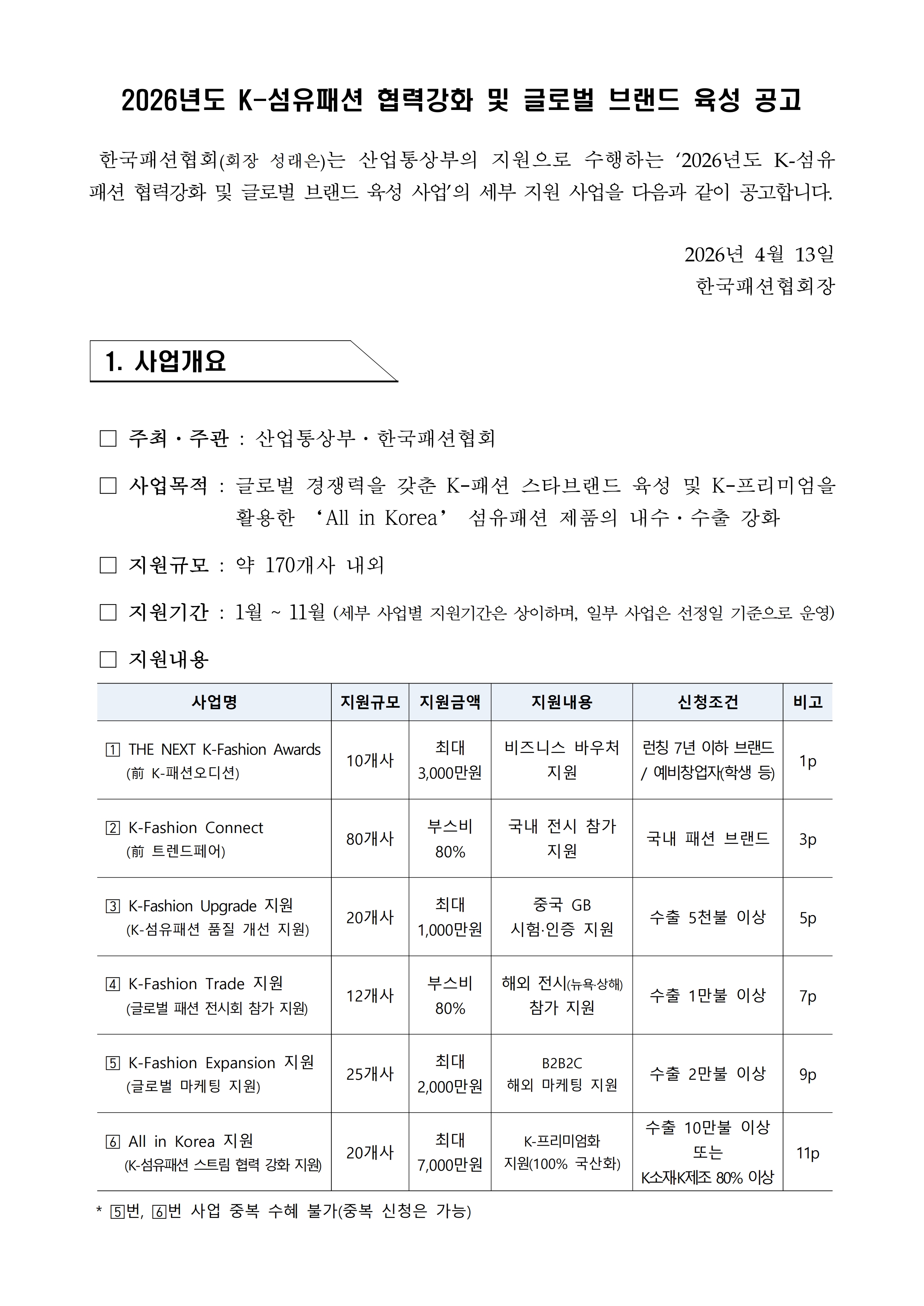 (사업 공고) 2026 K-섬유패션스트림 협력 강화 및 글로벌 브랜드 육성_한국패션협회_260413.pdf [420.48KB]