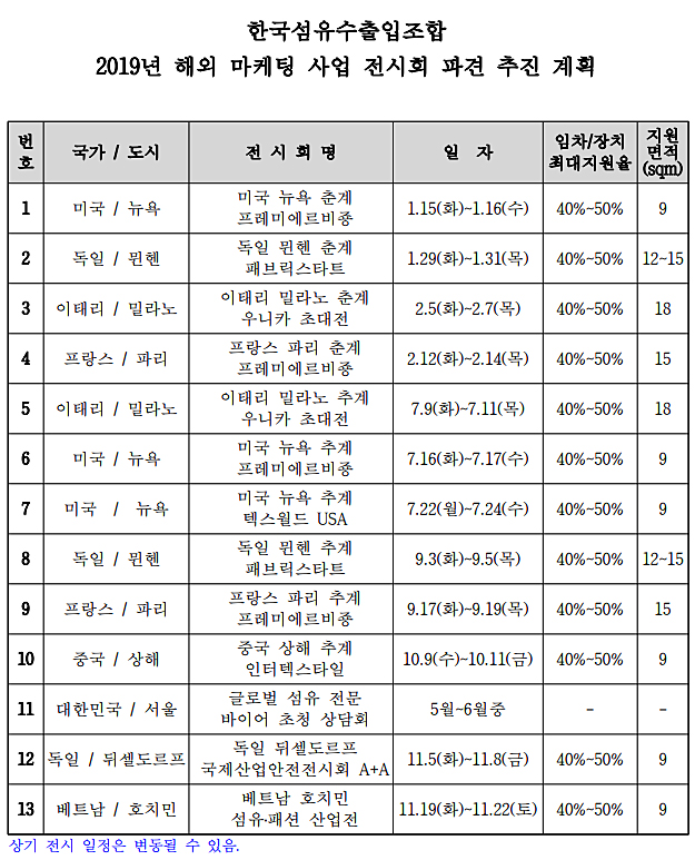 한국섬유수출입협회 2019년 해외마케팅 사업 파견 추진 계획은 www.ktextile.net 홈페이지 또는 www.textra.or.kr 에서도 확인할 수 있다.