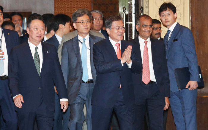 ▲ 대한상공회의소가 인도상의연합회와 공동으로 지난해 7월 9일 오후 인도 뉴델리 타지 디플로매틱 엔클레이브 호텔에서 개최한 한·인도 비즈니스 포럼에 문재인 대통령이 참석을 위해 입장하고 있다. © TIN뉴스