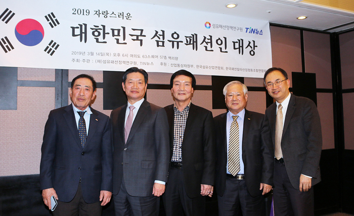 ▲ 지난 14일 여의도 63스퀘어에서 열린 대한민국 섬유패션인대상 시상식에 수상자인 이병학 전 반월조합이사장과 구홍림 현 이사장, 그리고 축하 차 참석한 정명필 패션칼라연합회장, 한상웅 대구경북패션조합 이사장, 부산녹산패션칼라조합 이경식 이사장이 기념사진을 찍고 있다. © TIN뉴스