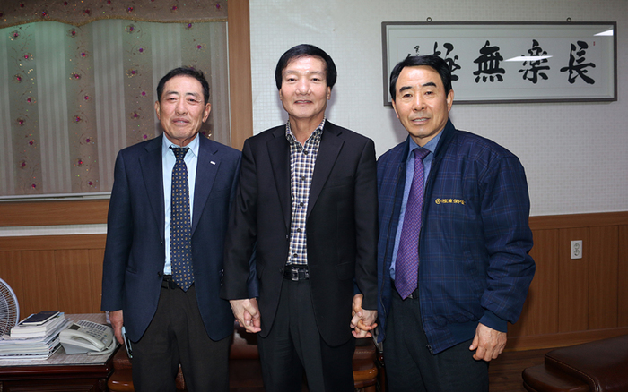 ▲ 지난 14일 정명필 패션칼라연합회장과 한상웅 대경패션조합 이사장이 동두천염색조합 노시웅 이사장을 만나 취임 인사와 협력을 당부했다. © TIN뉴스
