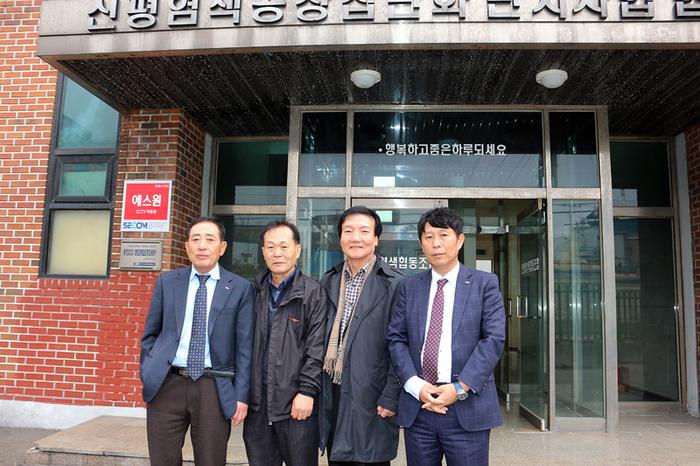 ▲ 지난 14일 정명필 패션칼라연합회장과 한상웅 대경패션조합 이사장이 포천양문과 포천신평염색조합 김세평 이사장과 장용준 이사장을 만나 취임 인사와 협력을 당부했다. © TIN뉴스