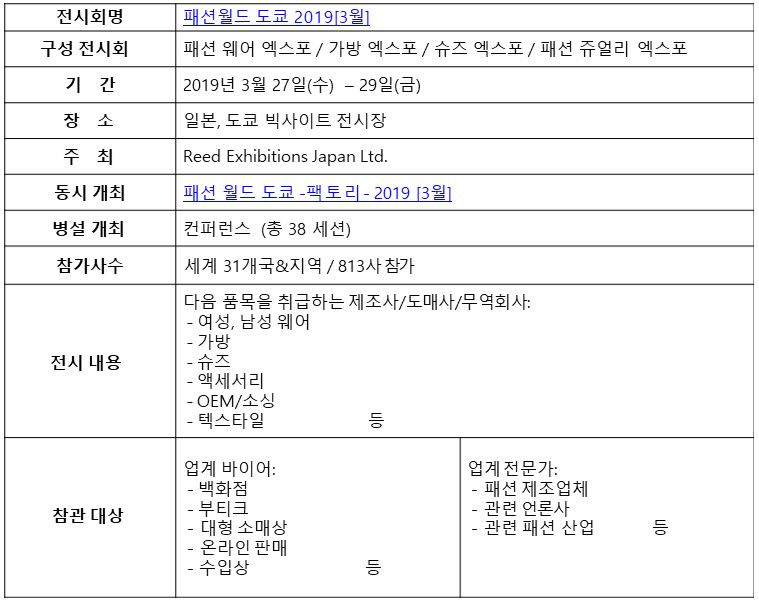 '패션 월드 도쿄’와 ‘패션 월드 도쿄-팩토리-’로 구성되어 패션 소싱, 소재, 브랜드등 패션 아이템을 총망라한 일본 패션 무역 전시회다.