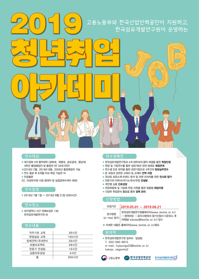만 34세 이하 청년 대졸(전문대졸) 미취업자를 대상으로 직원 채용을 희망하는 섬유기업, 구인을 희망하는 청년 미취업자들은 섬개연 일자리양성팀에 실시간 접수를 하면 된다.