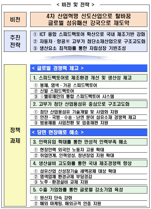 이는 앞서 6월 19일 정부가 내놓은 ‘제조업 르네상스 비전 및 전략’에서 제시한 ‘주력산업의 혁신을 통한 탈바꿈’의 일환으로 마련된 후속 대책이다. 섬유패션산업을 ICT, 5세대 이동통신과 융복합을 통해 스마트화하고, 자동차, 항공 첨단산업용 신소재 산업으로 탈바꿈시키는 혁신전략이 포함됐다.