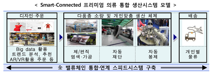 2021년부터 全 밸류체인 통합을 목표로 개인맞춤 의류 등 다양한 소량 개별 주문을 효율적으로 생산하기 위한 스마트공장 데이터 플랫폼 기반 협업시스템을 구현한다. (주문) 빅데이터 트렌드 분석, 개인별 디자인 추천, 증강(AR)·가상현실(VR) 주문 시스템 → (생산) 작업 지시서 자동 생서으 공정(제/편직, 염색·가공→봉제) 협업관리, 원부자재 관리 등 연계 → (배송) 개인별 물류 배송 수행 및 DB관리 등으로 시스템화되어진다.