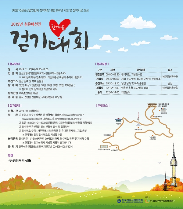 2019년 섬유패션인 한마음 걷기대회가 11월 16일 남산 순환길에서 열린다. 당일 오전 9시 30분 남산골한옥마을에 모여 남산 남측 및 북측 순환길을 걷는 일정이다.