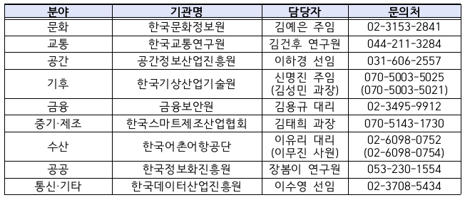* ’통신‘ 분야를 포함하여 지정된 전문기관이 없는 경우는 모두 K-DATA로 직접 접수 가능하며, 관련사항은 K-DATA에 문의(대표번호 : 1833-2246, 이메일 : datavoucher@kdata.or.kr)