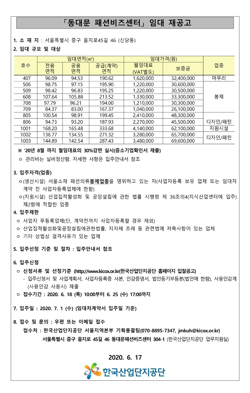 한국산업단지공단, 동대문패션비즈센터 임대 재공고