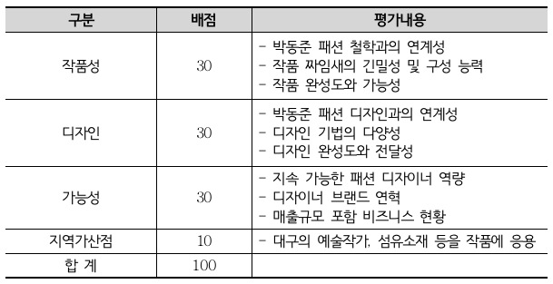 - 한국인으로서 패션분야 발전과 사회 공헌 가능성을 갖춘 패션 분야 유망자