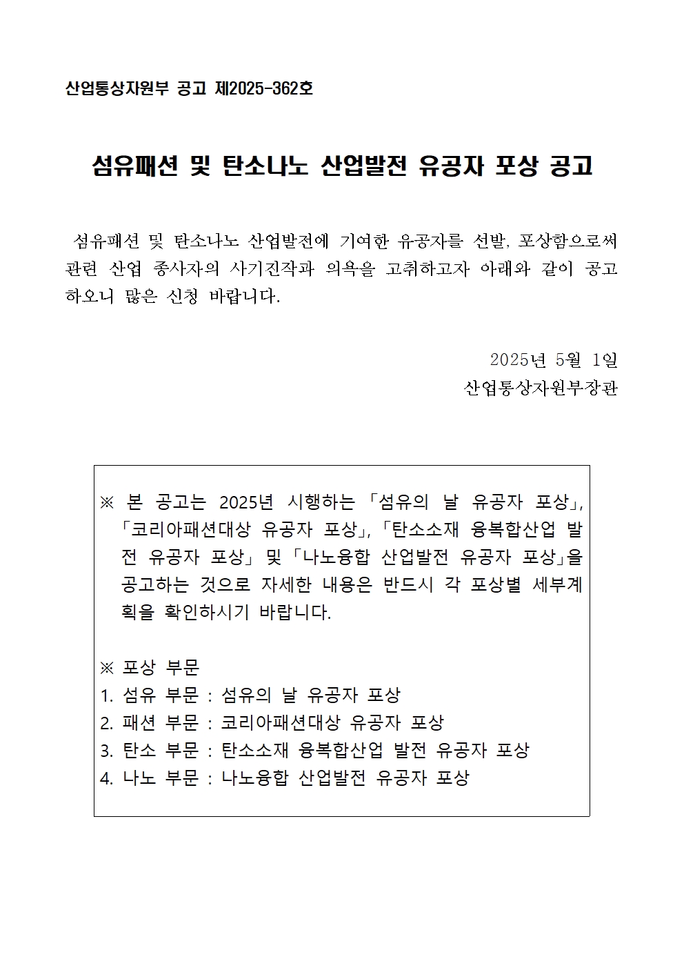 섬유패션 및 탄소나노 산업발전 유공 포상 공고(섬유).hwp [142.0KB]