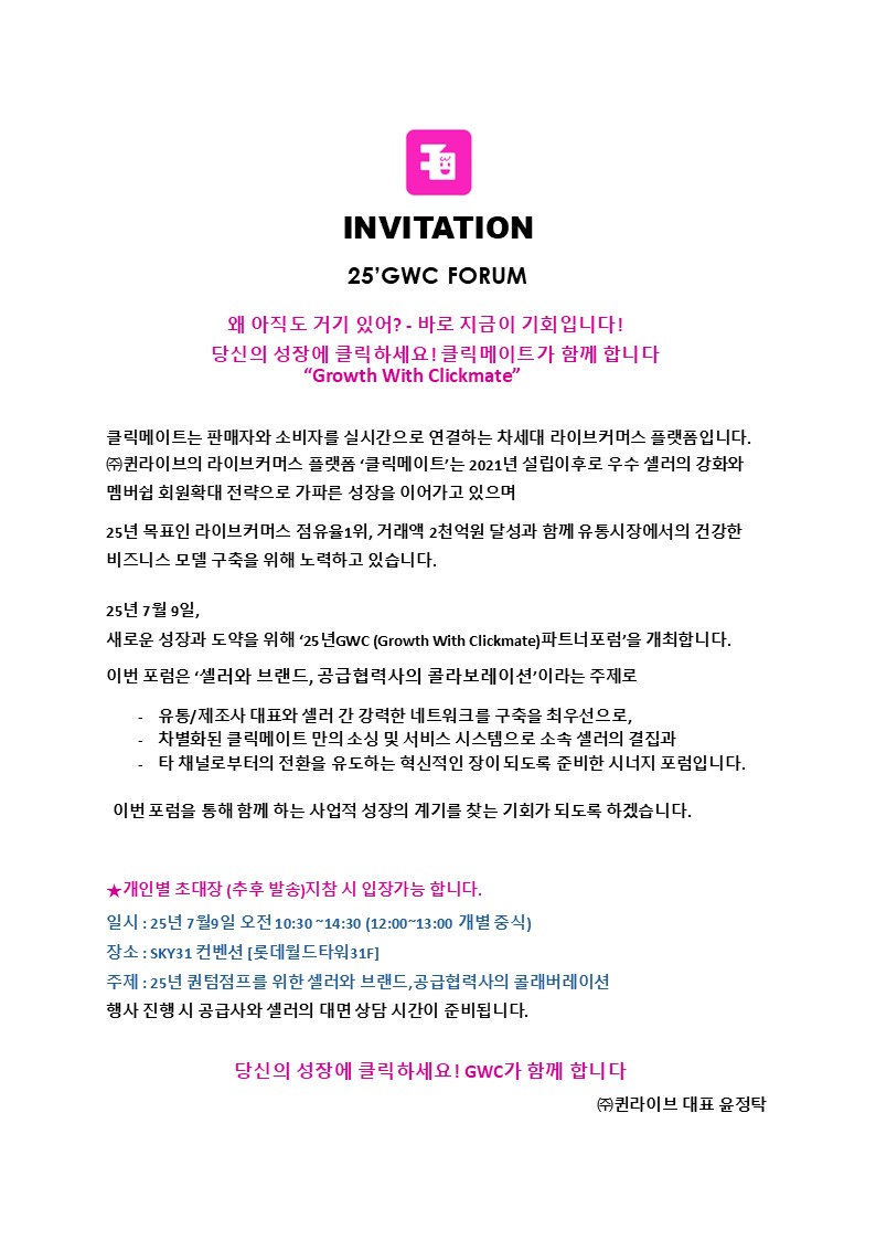 [안내](퀸라이브) 셀러와 브랜드, 공급협력사의 콜라보레이션 GWC(Growth With Clickmate) 파트너 포럼 개최 안내
