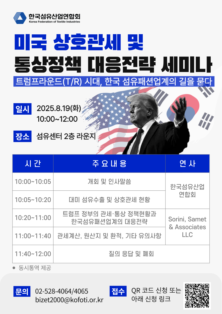 [안내](한국섬유산업연합회) 미국 상호관세 및 통상정책 대응전략 세미나 참가 신청 안내(8/19(화))