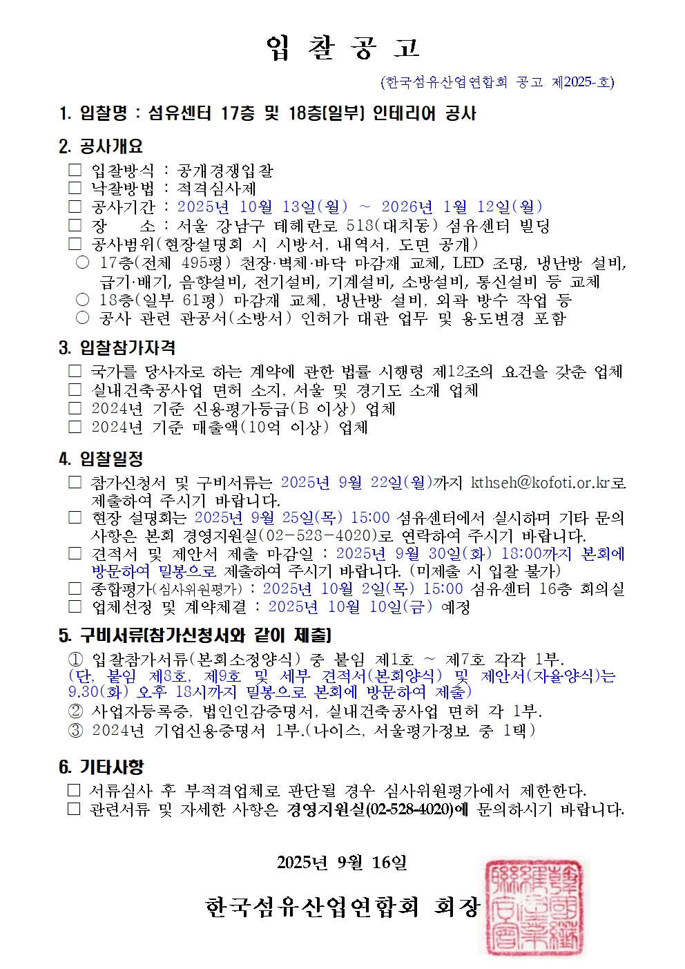 [공고](한국섬유산업연합회) 섬유센터 17층 및 18층(일부) 인테리어 공사 입찰