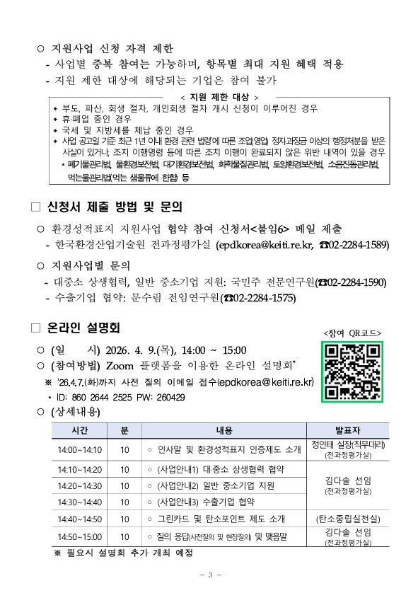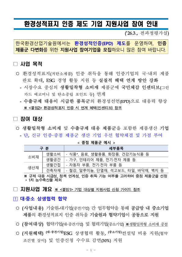 붙임2. 환경성적표지(저탄소제품) 인증 제도 기업 지원사업 안내문.pdf [426.16KB]