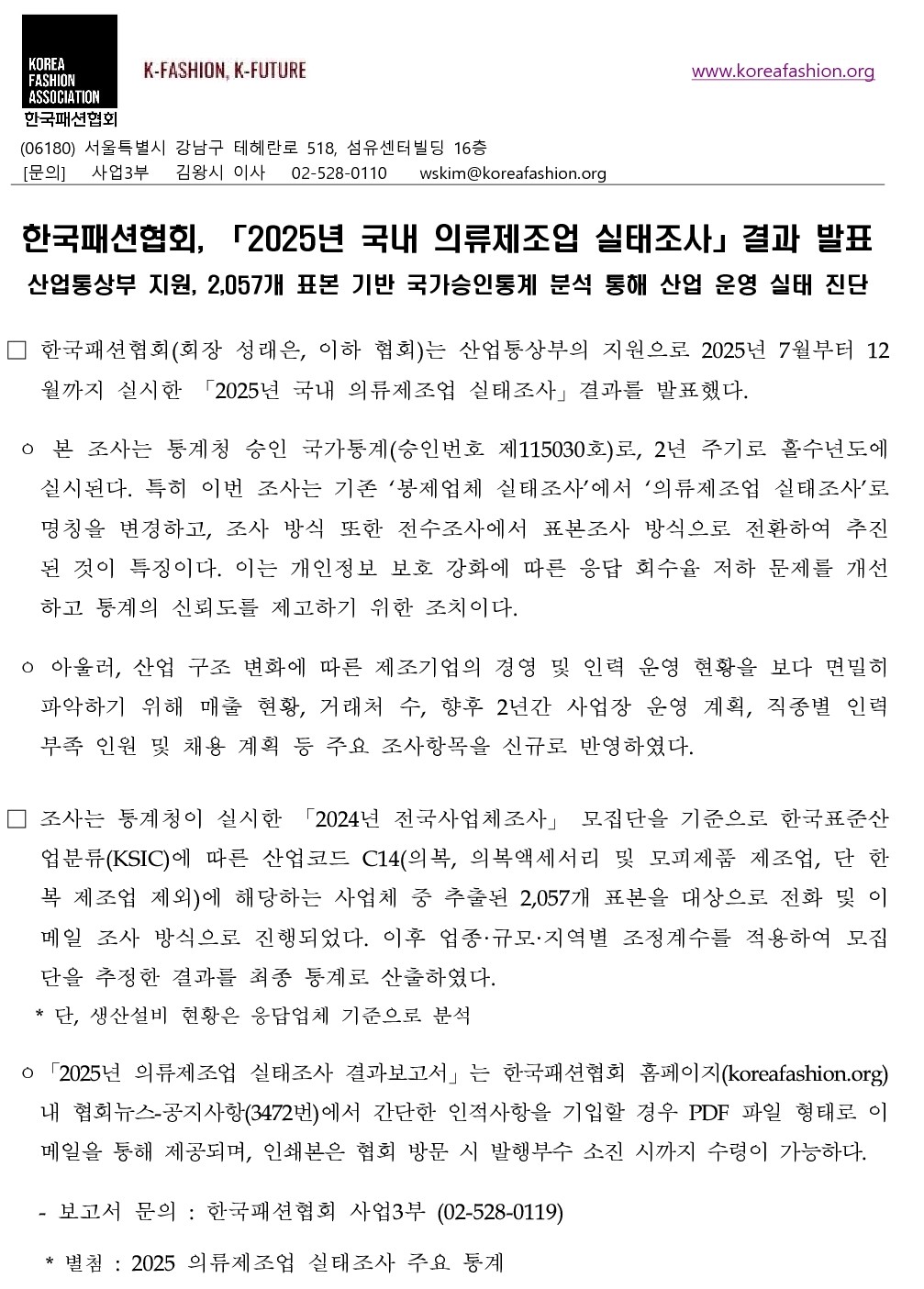 보도자료-패션협회_한국패션협회, 2025년 국내 의류제조업 실태조사 결과 발표_0226.pdf [105.86KB]