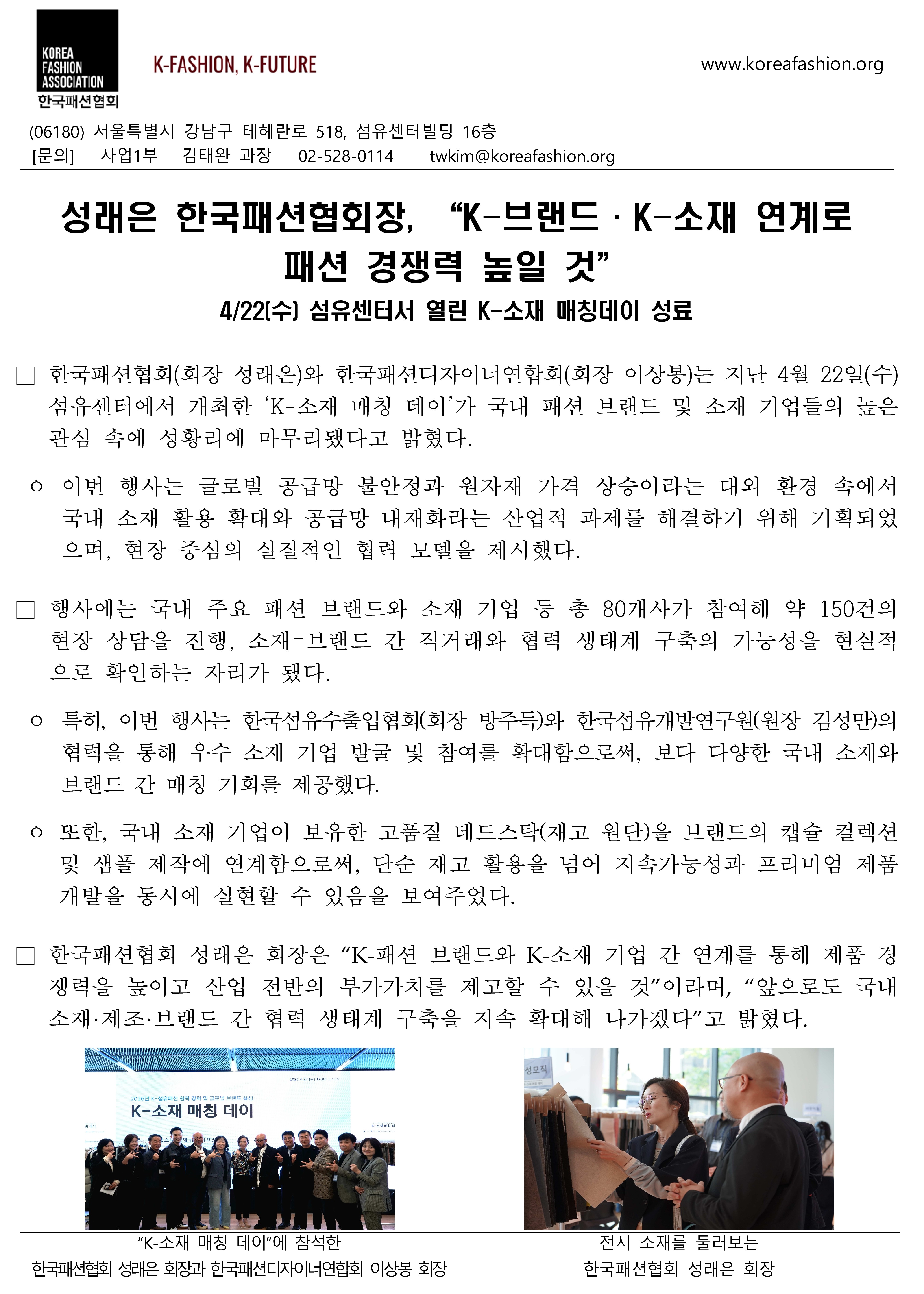 보도자료-패션협회_성래은 한국패션협회장, “K-브랜드·K-소재 연계로 패션 경쟁력 높일 것”.pdf [1.06MB]